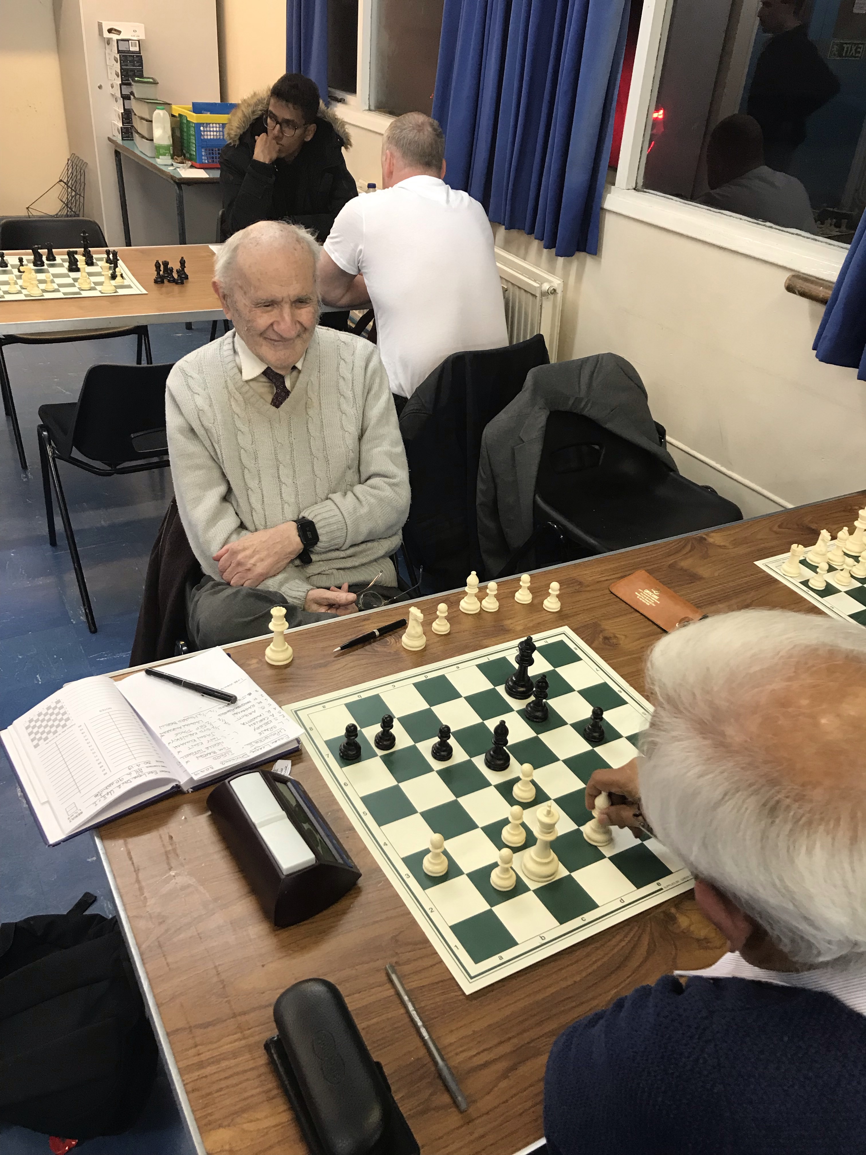 The match stated quietly with 4 quick draws, the wildest of them being Abbott v Kalinsky with bits on all sorts of unusual squares. Steve asked Syd for a daw but Syd, not hearing Steve’s enquiry, returned the offer & they quickly agreed to halve the game. I soon followed suit as did an equally careful Tony Kent and Howard Berlin, none of us wanting to make a blunder. It was good to have Howard back for us again after a long absence.