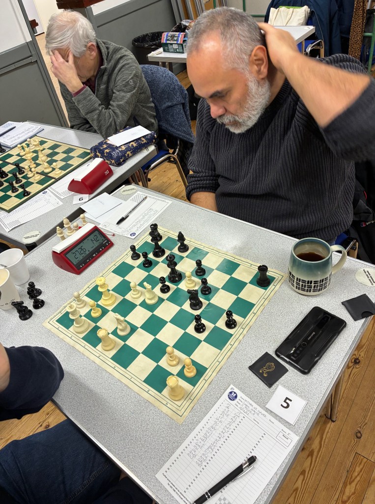 We started late but Barking had to default a board so we were 1 up but it seemed fruitless as by 8pm I only had 4 players playing chess. Then at 8pm Tony made it (M25 issues) but by 8.15 Neville still hadn’t arrived so I agreed his game could be a default and I went to make a coffee for myself and captain John Figgins. One minute after I’d agreed to give up Neville’s game he arrived but John generously agreed to let him play. As I sat down I glanced at my match score sheet- which at first I didn’t understand- to see that Vincenzo had already won! So from being almost 2 defaults down we were now 2-0 up. Figgins got control of the centre but as I managed to swap off Q’s I offered a draw and to my surprise he agreed. This was eventually followed up by Noah beating Vladimir after almost losing control of the game and finally pinning Vlad’s Q against his King. The top 2 boards were much tougher games. Tony held off Colin’s Sicilian Morra Gambit Accepted and played nicely into the middle game . But in the endgame when Colin finally freed his N it proved a winner against Tony’s over-stretched B and pawns. Neville, after arriving 45 minutes late, used his remaining time well and had a sharp game against Peter’s French Defence. After a strong opening Nev won a R for a B which he held into a winning ending. So after our draw at Thurrock, we now had a match win under our belts.