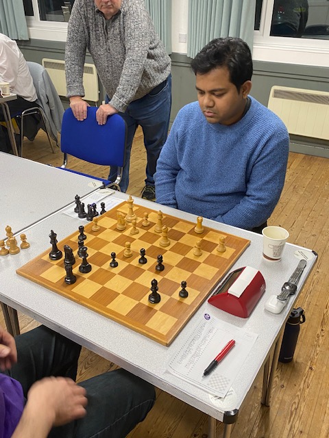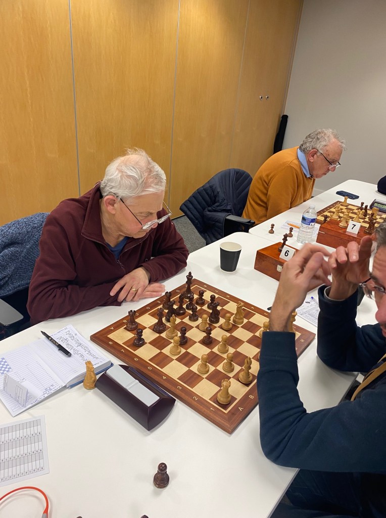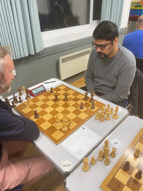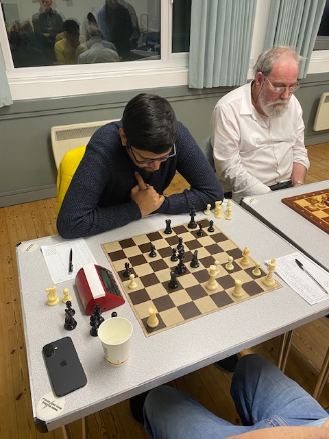 Likewise, Jef also won R for N but with Figgins having sufficient pawns to hold off any significant attack,he had to accept a half. Adhar put Steve Berkley’s K- side under pressure and began to run a pawn up the board but Steve followed suit with his a-pawn which was equally powerful so both survived to halve the game.