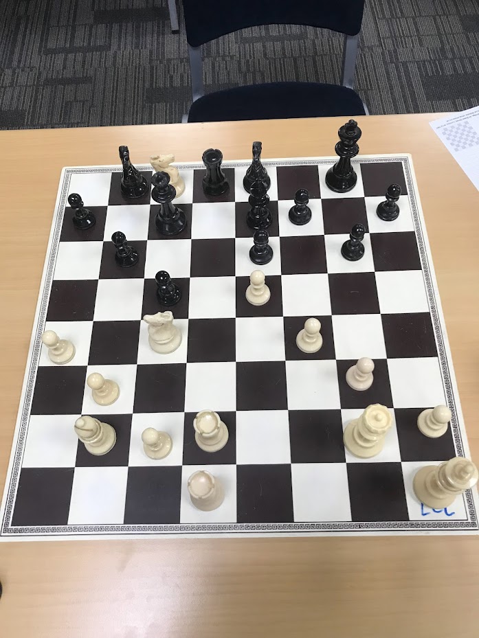 Kent & Barclay soon took an amicable draw but we were doing OK on the other boards. Chauhan quickly sent Parker’s King on a walk-about from e1 out to f3 & e3. At one point his King was his best developed piece and Anurag backed that up by forcing a supported pawn up to c3. But as the win slipped away Robert was able to bring his King safely home & unravel his pieces to win the endgame.