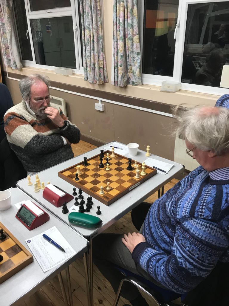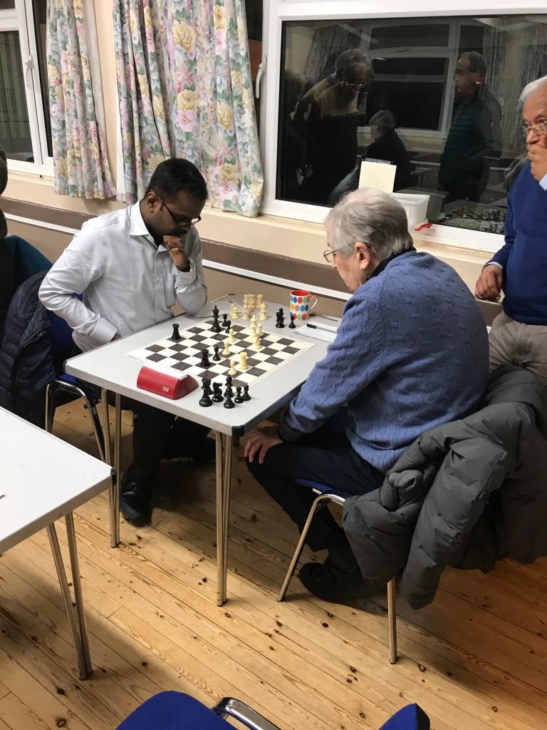 Hassan quickly got the better of Chirea-Florica and won a R to give Mugalu 2 B’s against a lone Knight which was hopelessly overworked. Neville beat off Hunnable’s good opening and his counter attack paid dividends. Anthony Kent took took control of the centre to slowly but surely ground down SIddo’s game. But, on the lower boards it all changed where Venkatesh lost to Keith Jones (again) and Sid, although playing well, his 2 B’s against 2 N’s seemingly had a draw in hand at least, until he blundered at the end. So it came down to Jef’s game where his development was good held Nickal’s King in the centre. But as black unravelled his pieces, it then came down to an endgame where with only had seconds left, Jef did enough so that his extra pawn advantage was squandered in the time scramble and they ended the game with just 2 Kings on the board.